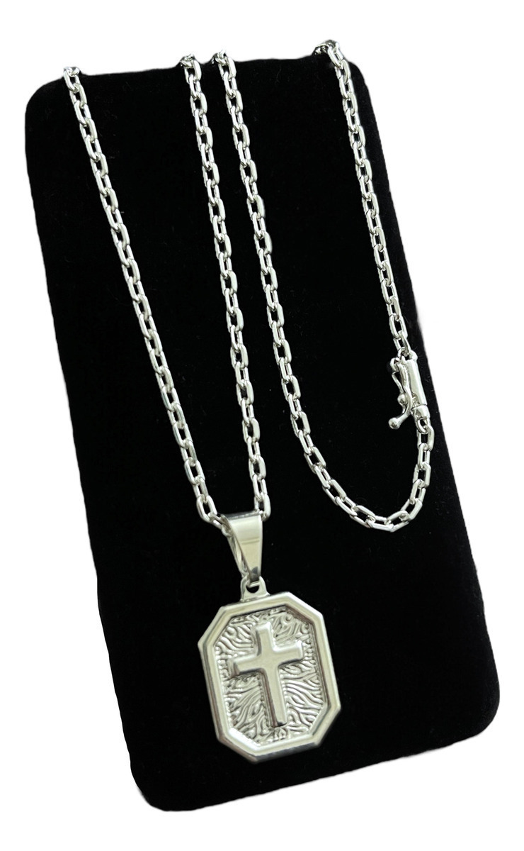 Cordão Cadeado 2mm + Pingente Cruz Placa Banhado A Prata 925