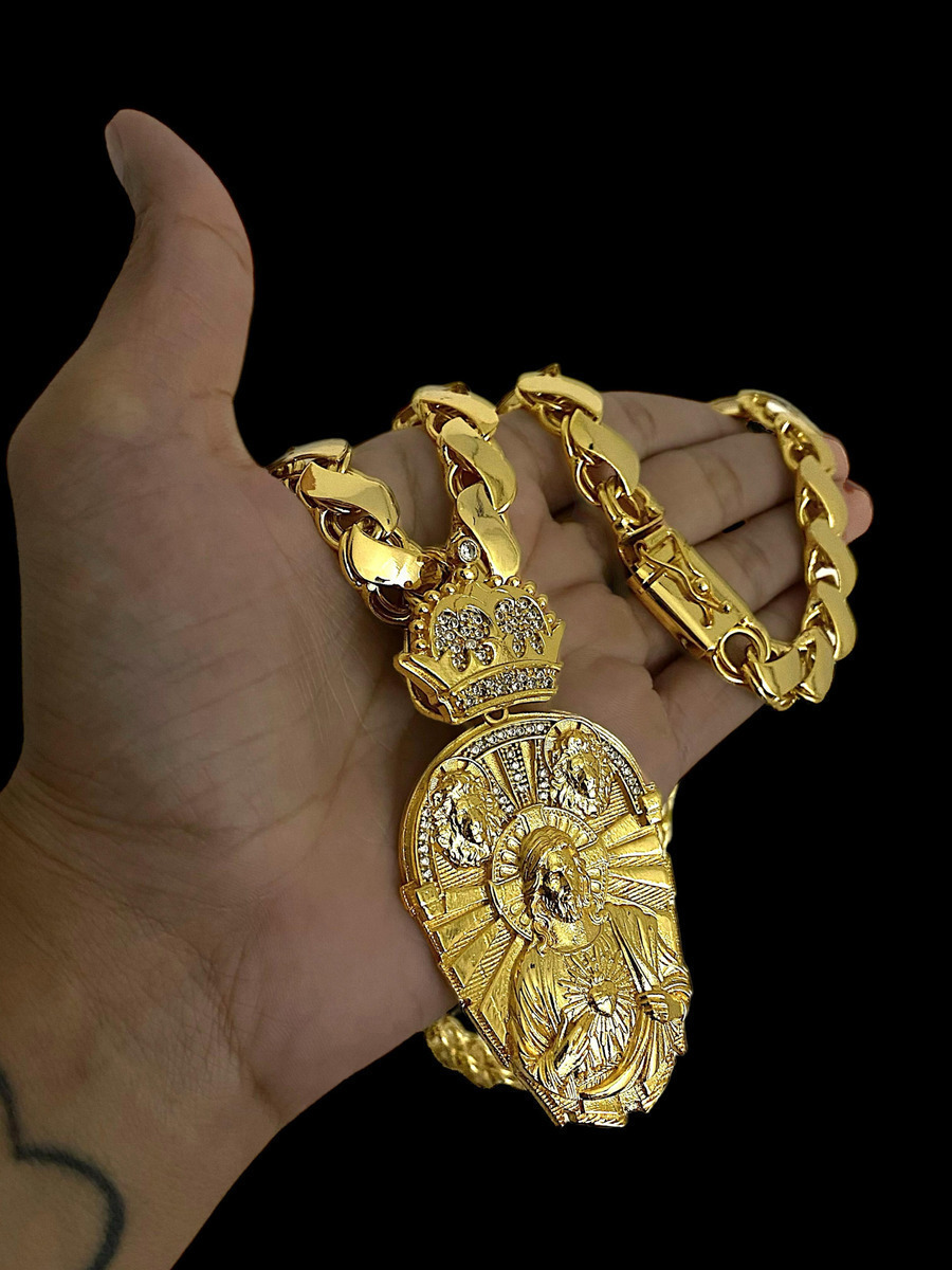 Cordão Friso S 13mm + Pingente Jesus Leão Oval Banhado A Ouro 18k
