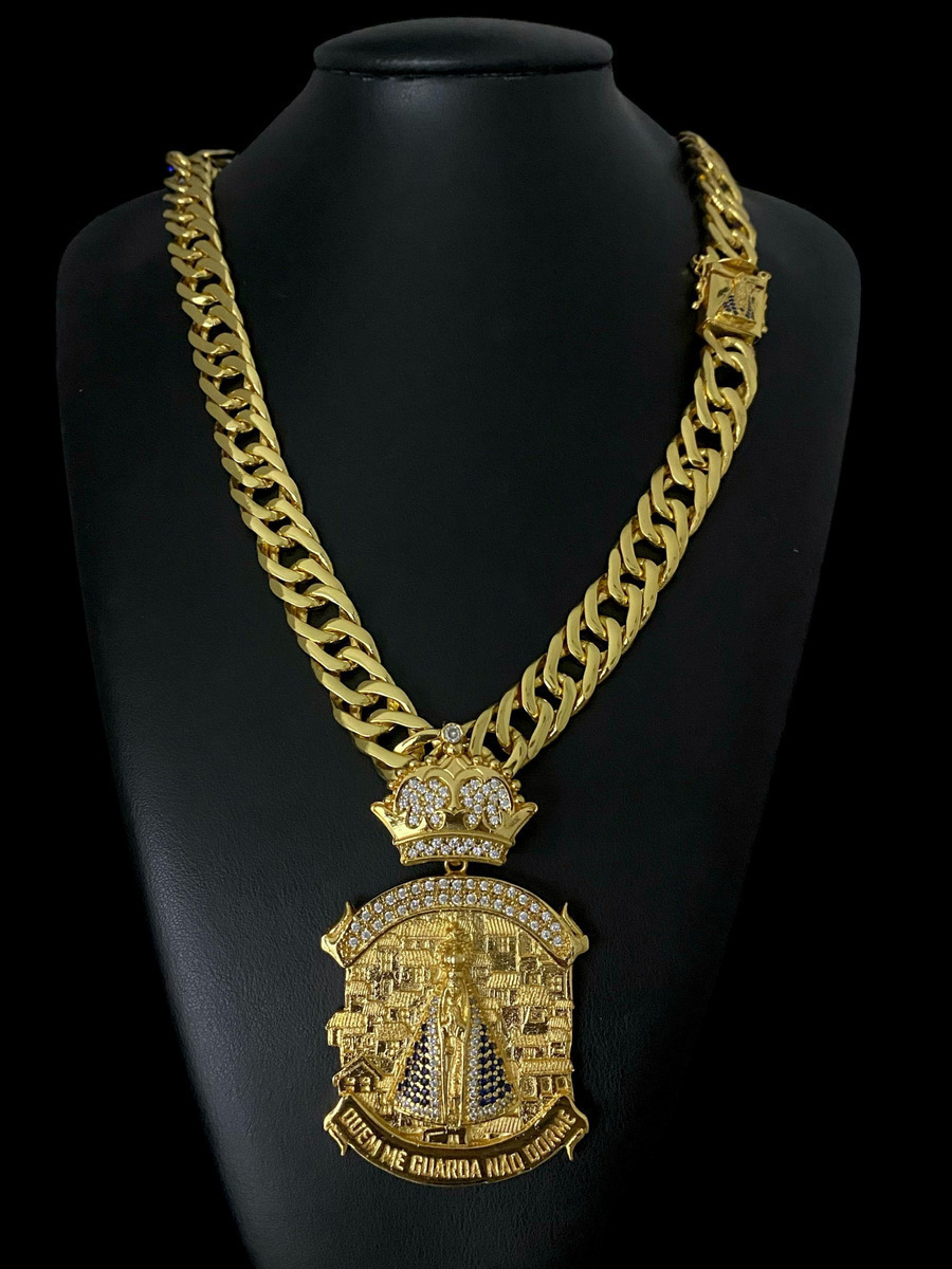 Cordão Grumet 15mm Fecho Santa + Pingente Santa Banhado A Ouro 18k