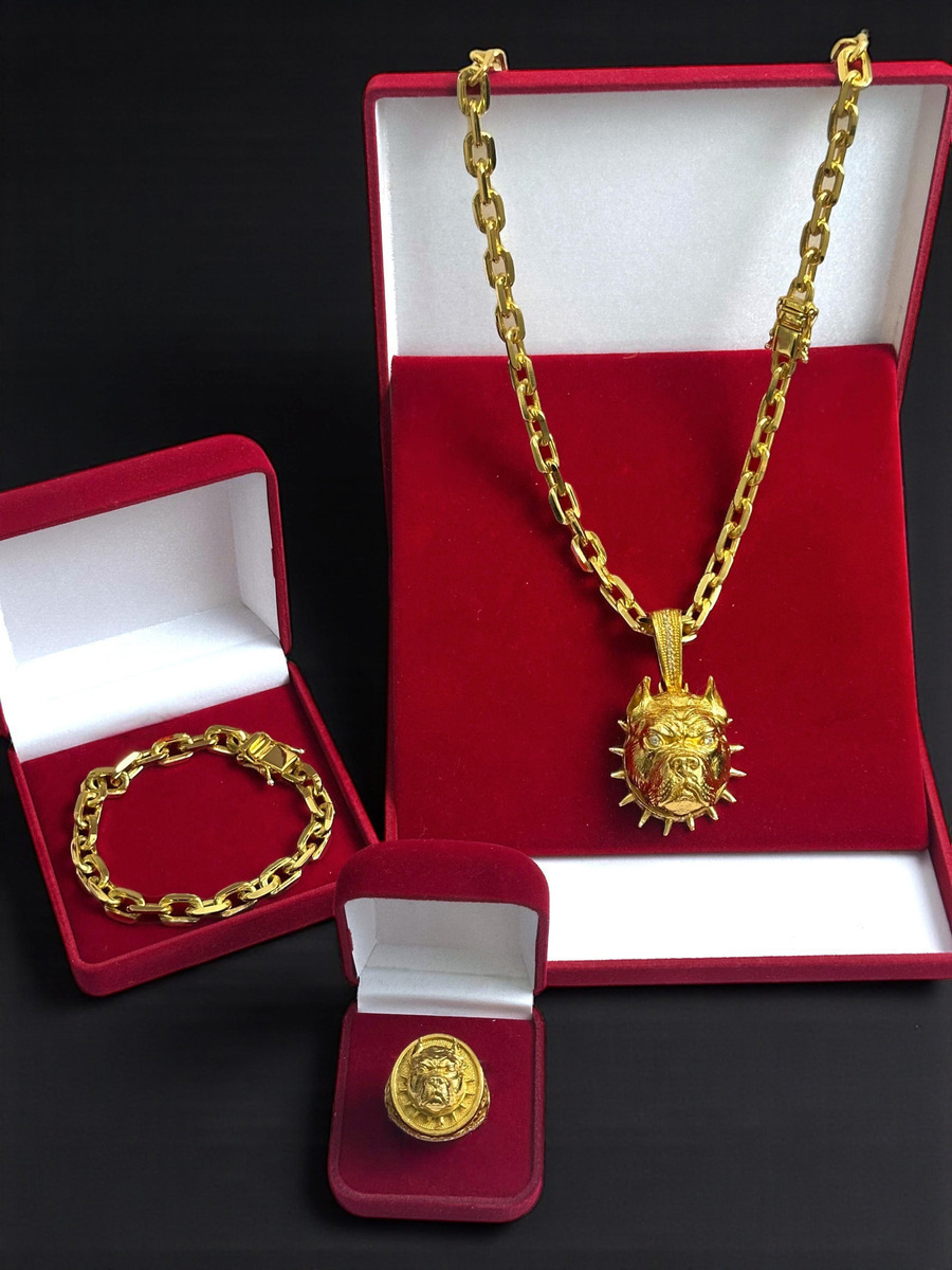 Kit Cadeado 10mm + Pingente Pitbull Tradicional + Anel Pitbull 3D Banhado a Ouro 18k
