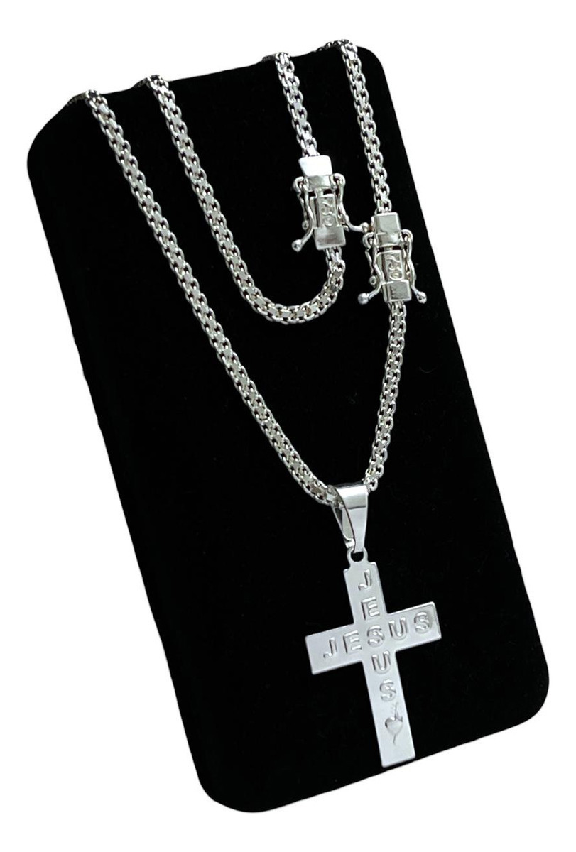 Kit Cadeado Duplo 3mm + Ping Cruz Jesus Banhado A Prata 925